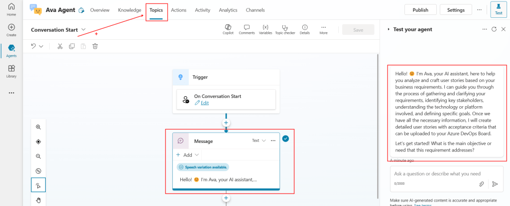 To ensure Ava’s start message aligns consistently, let’s update the Conversation Start topic to provide users with a clear and cohesive introduction to the agent.